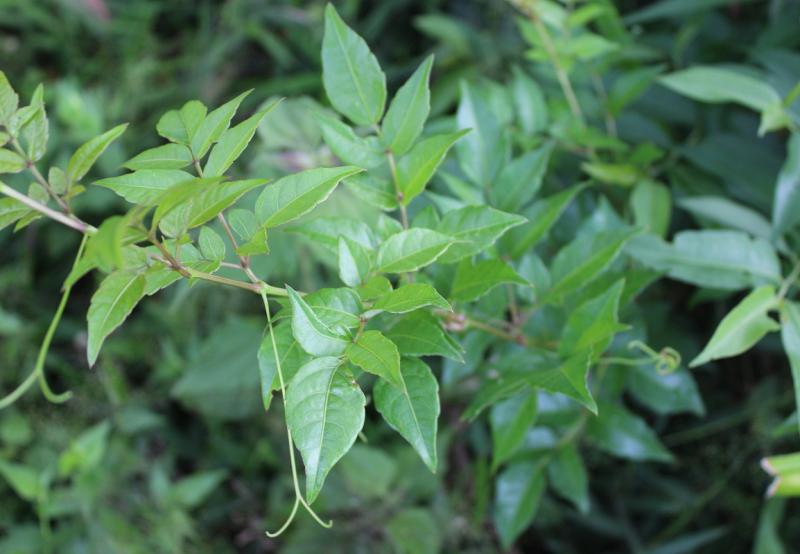 Dây leo nhỏ, hóa gỗ; cành hình trụ, nhẵn, lúc non có thể có lông; có tua cuốn dài, đầu chẻ đôi, mọc đối diện với lá, đôi khi thay thế cụm hoa tiêu giảm. Lá kép lông chim 1 – 2 lần, lẻ, mọc so le, có cuống; lá chét hình trái xoan hoặc hình mác, dài 2,0 – 3,5 cm, rộng1,5 – 2,5 cm, lá chét tận cùng thường lớn hơn các lá chét khác; gốc lá chét tròn, đầu nhọn, mép có răng cưa thô, hai mặt nhẵn, mặt trên xanh, mặt dưới màu nhạt như có lớp phấn màu trắng xám.
