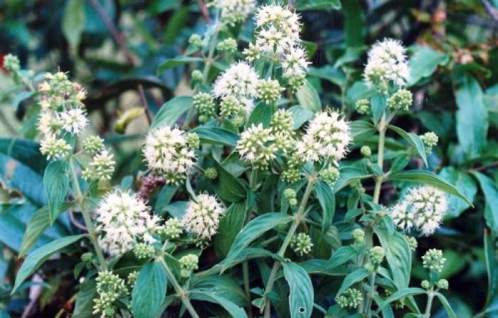 Cụm hoa mọc ở kẽ lá hoặc đầu cành thành xim phân đôi gồm những đầu tròn. Hoa nhiều, màu trắng hoặc trắng vàng, 4 lá đài hình giáo nhọn, ống đài dài 1,5 cm, nhẵn; 4 cánh hoa có lông ở mặt ngoài, tràng hoa hình ống, dài 2 mm, có lông ở họng; 4 nhị, chỉ nhị ngắn, bao phấn hình dải, vượt ra ngoài tràng; bầu 2 ô, có lông.