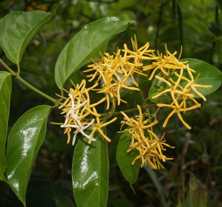 Cụm hoa hình chùy, mọc ở đầu cành, dài 6 – 8 cm, có lông. Hoa màu vàng, mùi thơm hắc; đài dạng ống ngắn 2 mm, xẻ thành 5 cành đài nhọn, có lông; 5 cánh hoa thuôn hẹp, phần dưới liền tạo thành ống dài 6 – 8 mm; 5 nhị dài 12 mm, đính ở họng tràng, chỉ nhị mảnh, bao phấn hình mũi tên; bầu nhẵn, 2 ô.