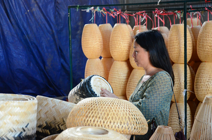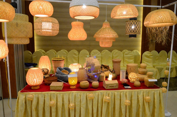 Các sản phẩm mây tre được trưng bày tại Hội thảo khởi động dự án Phát triển bên vững và toàn diện chuỗi giá trị tre và nghêu ở Việt Nam
