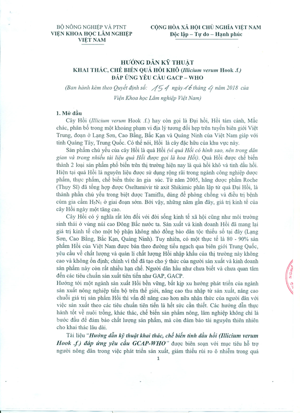 HƯỚNG DẪN KỸ THUẬT KHAI THÁC, CHẾ BIẾN QUẢ HỒI KHÔ (Illicium verum Hook .f.) ĐÁP ỨNG YÊU CẦU GACP – WHO