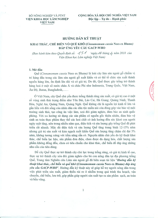 HƯỚNG DẪN KỸ THUẬT KHAI THÁC, CHẾ BIẾN VỎ QUẾ KHÔ (Cinnamomum cassia Nees ex Blume) ĐÁP ỨNG YÊU CẦU GACP-WHO