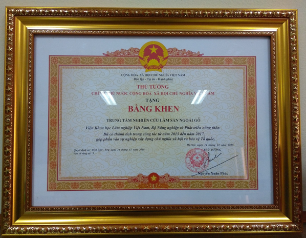 Ngày 14/11/2018 trung tâm nghiên cứu Lâm sản ngoài gỗ đã vinh dự được nhận bằng khen thủ tướng chính phủ số 1553/QĐ-TTg “Đã có thành tích trong công tác từ năm 2013 đến năm 2017, góp phần vào sự nghiệp xây dựng Chủ nghĩa xã hội và Bảo vệ Tổ Quốc”